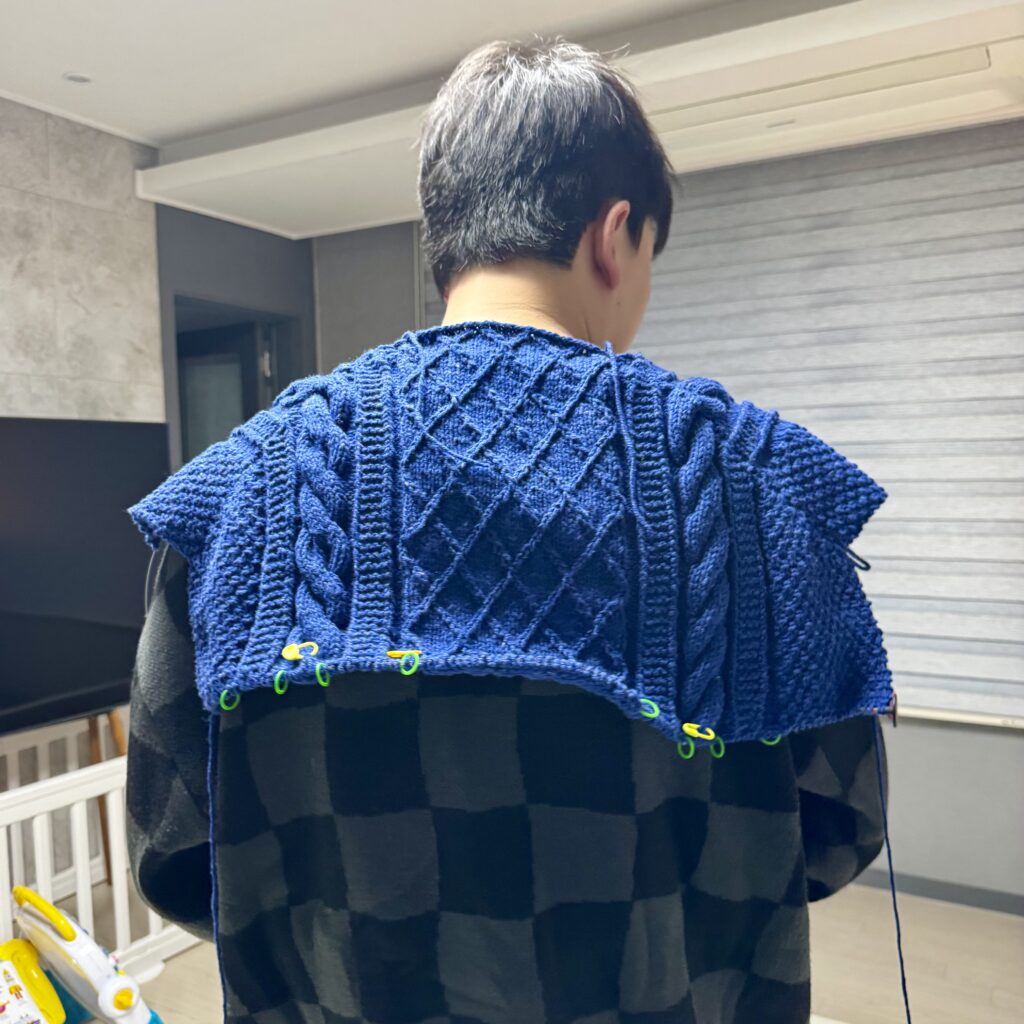 디자이너 기준인 20코 28단에 맞추기 위해 더 굵은 바늘을 시도할 수도 있었지만, 실의 조직감과 케이블 무늬의 형태가 무너질 가능성이 있었다. 대신 6mm 바늘을 유지한 채 한 사이즈 큰 도안을 선택했다.